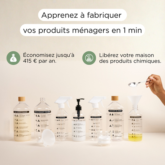 Fabriquez tous vos produits ménagers en 1 minute chrono avec nos flacons gradués. 10 fois moins cher, 100% naturel, plus efficace que vos recettes DIY ratées.