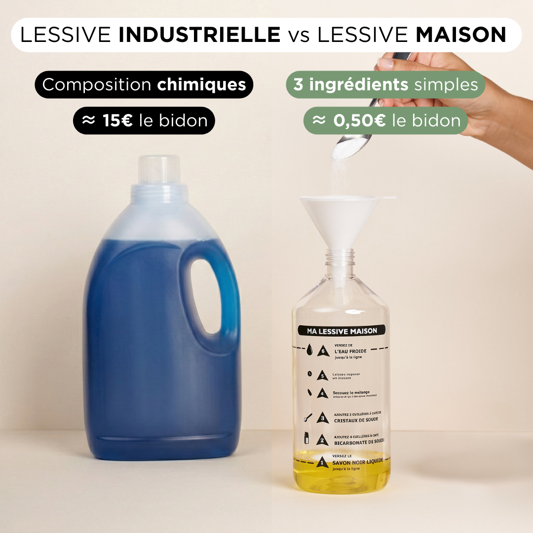 Un bidon de lessive à 10€ coûte 30 centimes à fabriquer. Vous payez 80% d'eau au prix de l'or.